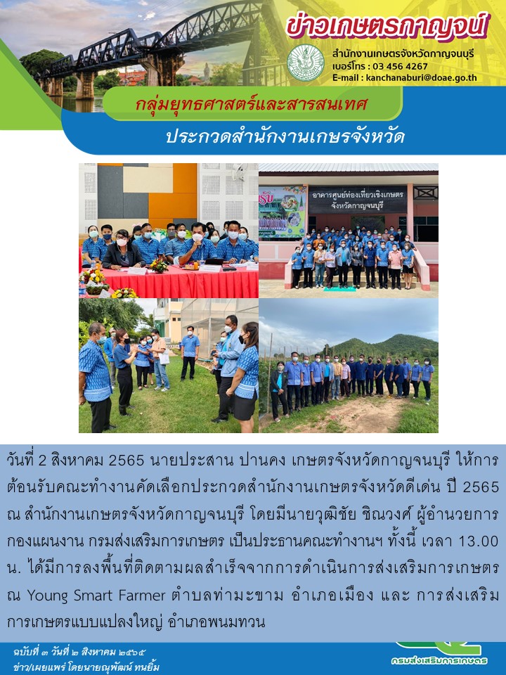 วันที่ 2 สิงหาคม 2565 นายประสาน ปานคง เกษตรจังหวัดกาญจนบุรี ให้การต้อนรับคณะทำงานคัดเลือกประกวดสำนักงานเกษตรจังหวัดดีเด่น ปี 2565