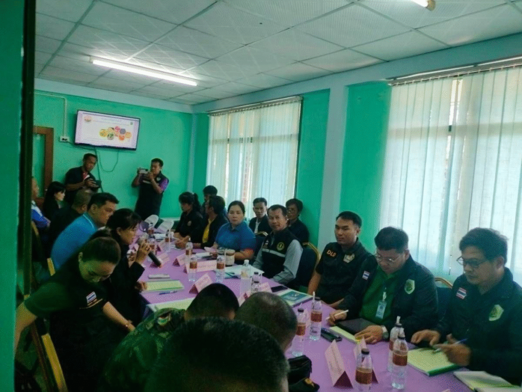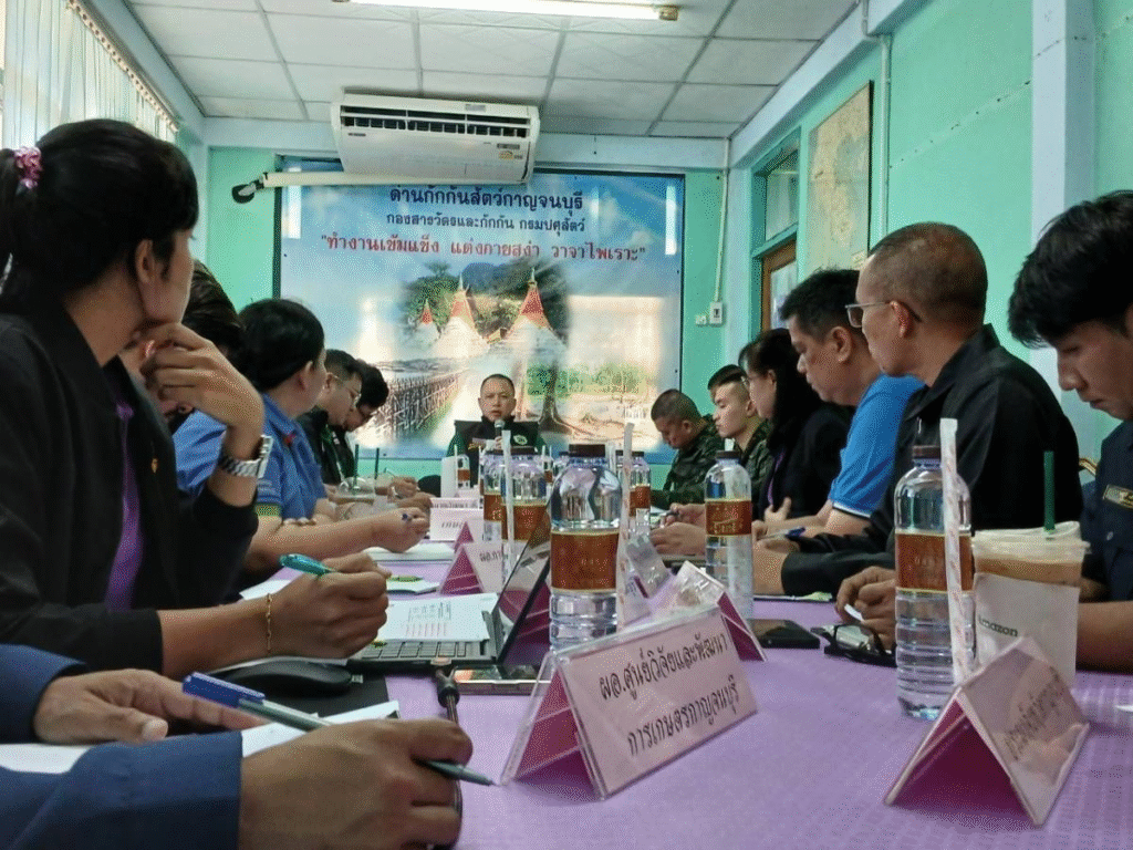 วันที่ 16 พฤศจิกายน 2567 นายวีระศักดิ์ สุขทองเกษตรจังหวัดกาญจนบุรี พร้อมด้วย นายชยุติ โสไกร หัวหน้ากลุ่มส่งเสริมและพัฒนาการผลิต และ นางสาววรรณภรณ์ สง่ากชกร นักวิชาการส่งเสริมการเกษตรชำนาญการ รักษาราชการแทน เกษตรอำเภอสังขละบุรี เข้าร่วมประชุมติดตามสถานการณ์การลักลอบนำเข้าสินค้าเกษตรผิดกฎหมาย(พืช ประมง ปศุสัตว์)ณ ห้องประชุมด่านกักกันสัตว์กาญจนบุรี โดยมีพันเอกรวิรักษ์ สัตตบุศย์ ที่ปรึกษารัฐมนตรีว่าการกระทรวงเกษตรและสหกรณ์ เป็นประธานในการประชุม เรื่องการค้าขายสินค้าเกษตรชายแดน โดยมีประเด็นหลักคือการรับทราบข้อมูลเกี่ยวกับยางสวมสิทธิ์ฝั่งเมียนม่าร์ที่จะข้ามมาขายฝั่งประเทศไทย ซึ่งในที่ประชุมให้เร่งแก้ไขปัญหาดังกล่าวแบบบูรณาการทุกหน่วยงาน พร้อมกับขึ้นทะเบียนเกษตรกรให้ถูกต้องในพื้นที่ ณ ด่านกักกันสัตว์กาญจนบุรี