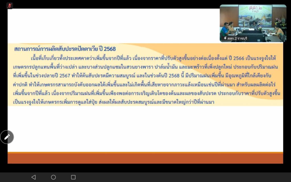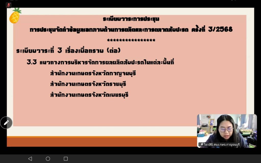 ร่วมประชุมจัดทำข้อมูลเอกภาพด้านการผลิตและการตลาดสับปะรด ครั้งที่ 3/2568 ผ่านระบบ Zoom Meeting ณ สำนักงานเกษตรอำเภอด่านมะขามเตี้ย จังหวัดกาญจนบุรี