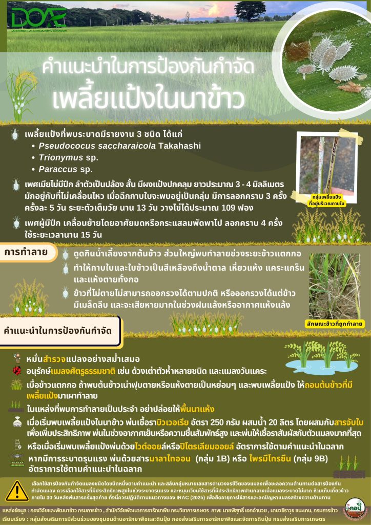 หมั่นสำรวจแปลงข้าวอย่างสม่ำเสมอ ตั้งแต่ระยะแตกกอ เพื่อเฝ้าระวังการเข้าทำลายของเพลี้ยแป้งในนาข้าว