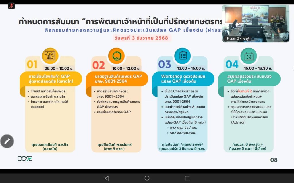 นางสาวสุรัชณี พวงศิริ เกษตรอำเภอด่านมะขามเตี้ย มอมหมายเจ้าหน้าที่สำนักงานเกษตรอำเภอด่านมะขามเตี้ย เข้าร่วมสัมมนาเชิงปฏิบัติการ การพัฒนาเจ้าหน้าที่เป็นที่ปรึกษาเกษตรกรและเป็นวิทยากรด้านมาตรฐาน GAP ประจำปีงบประมาณ พ.ศ. 2569 กิจกรรมถ่ายทอดความรู้และฝึกตรวจประเมินแปลง GAP เบื้องต้น มาตรฐานสินค้า การปฏิบัติบัติทางการเกษตรที่ดี GAP และตรวจประเมินแปลง GAP เบื้องต้น ผ่านระบบประชุมทางไกลออนไลน์ Zoom Meeting ณ สำนักงานเกษตรอำเภอด่านมะขามเตี้ย จังหวัดกาญจนบุรี