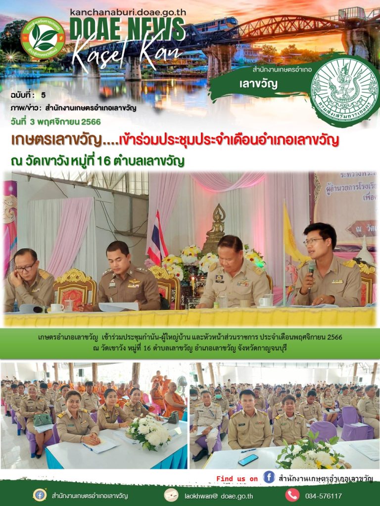 วันที่ 3 พฤศจิกายน 2566 นายวีรธรรม ชูใจ เกษตรอำเภอเลาขวัญ เข้าร่วมการประชุมกำนัน-ผู้ใหญ่บ้าน และหัวหน้าส่วนราชการ ประจำเดือนพฤศจิกายน 2566 โดยในส่วนของสำนักงานเกษตรอำเภอเลาขวัญมีเรื่องแจ้ง ดังนี้