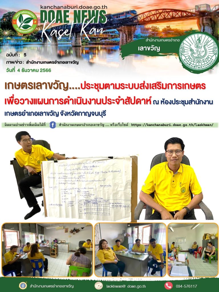 วันที่ 4 ธันวาคม 2566 นายวีรธรรม ชูใจ เกษตรอำเภอเลาขวัญ พร้อมเจ้าหน้าที่ ดำเนินการประชุมตามระบบส่งเสริมการเกษตรเพื่อสรุปผลการดำเนินงานที่ผ่านมาและวางแผนการดำเนินงานประจำเดือนธันวาคม 2566 โดยมีแผนการจัดอบรม ดังนี้