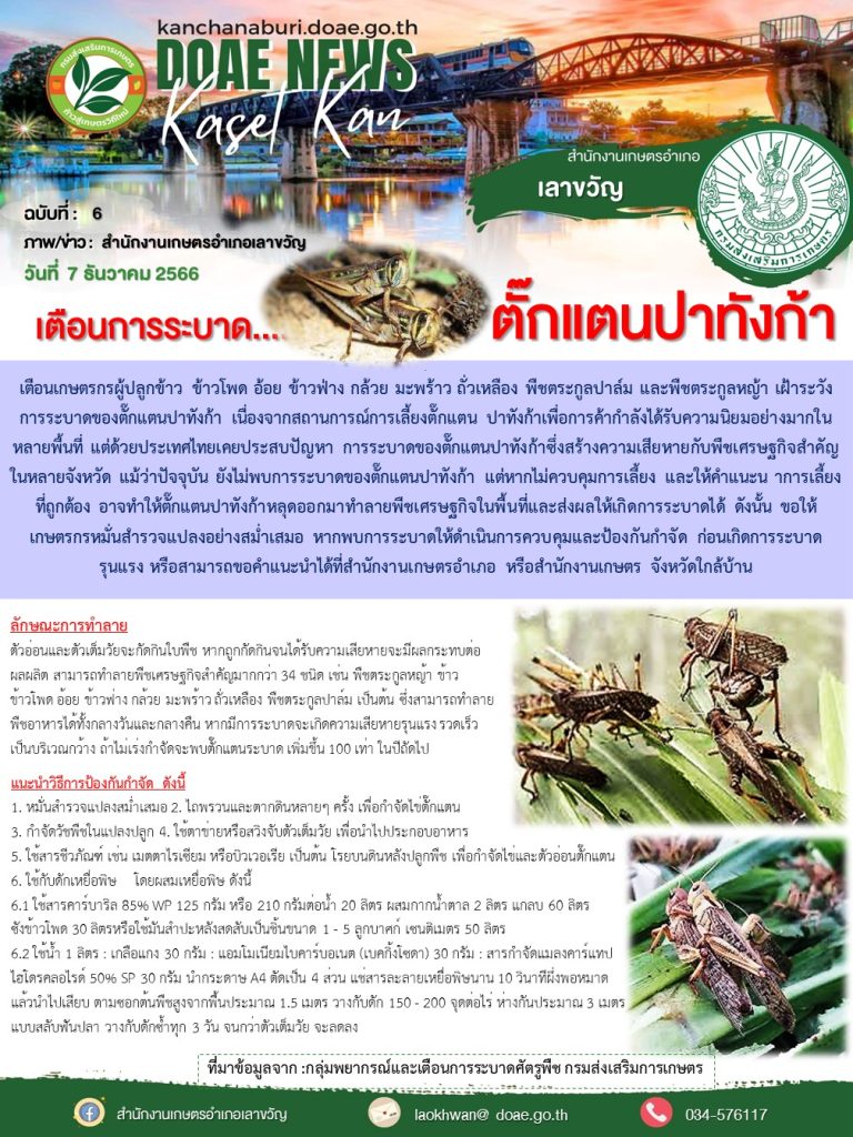 เตือนเกษตรกรผู้ปลูกข้าว ข้าวโพด อ้อย ข้าวฟ่าง กล้วย มะพร้าว ถั่วเหลือง พืชตระกูลปาล์ม และพืชตระกูลหญ้า เฝ้าระวังการระบาดของตั๊กแตนปาทังก้า เนื่องจากสถานการณ์การเลี้ยงตั๊กแตน ปาทังก้าเพื่อการค้ากำลังได้รับความนิยมอย่างมากในหลายพื้นที่ แต่ด้วยประเทศไทยเคยประสบปัญหา การระบาดของตั๊กแตนปาทังก้าซึ่งสร้างความเสียหายกับพืชเศรษฐกิจสำคัญในหลายจังหวัด แม้ว่าปัจจุบัน ยังไม่พบการระบาดของตั๊กแตนปาทังก้า แต่หากไม่ควบคุมการเลี้ยง และให้คำแนะน าการเลี้ยงที่ถูกต้อง อาจทำให้ตั๊กแตนปาทังก้าหลุดออกมาทำลายพืชเศรษฐกิจในพื้นที่และส่งผลให้เกิดการระบาดได้ ดังนั้น ขอให้เกษตรกรหมั่นสำรวจแปลงอย่างสม่ำเสมอ หากพบการระบาดให้ดำเนินการควบคุมและป้องกันกำจัด ก่อนเกิดการระบาดรุนแรง หรือสามารถขอคำแนะนำได้ที่สำนักงานเกษตรอำเภอ หรือสำนักงานเกษตร จังหวัดใกล้บ้าน