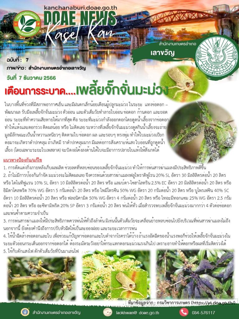 2. ถ้าไม่มีการป้องกันกำจัด มะม่วงจะไม่ติดผลเลย จึงควรพ่นด้วยสารฆ่าแมลงฟลูไพราดิฟูโรน 20% SL อัตรา 30 มิลลิลิตรต่อน้ำ 20 ลิตร หรือ ไดโนทีฟูแรน 10% SL อัตรา 10 มิลลิลิตรต่อน้ำ 20 ลิตร หรือ แลมบ์ดา-ไซฮาโลทริน 2.5% EC อัตรา 20 มิลลิลิตรต่อน้ำ 20 ลิตร หรือ อิมิดาโคลพริด 70% WG อัตรา 5 กรัมต่อน้ำ 20 ลิตร หรือ ไพมีโทรซีน 50% WG อัตรา 20 กรัมต่อน้ำ 20 ลิตร หรือ บูโพรเฟซิน 40% SC อัตรา 10 มิลลิลิตรต่อน้ำ 20 ลิตร หรือ ฟลอนิคามิด 50% WG อัตรา 4 กรัมต่อน้ำ 20 ลิตร หรือ ไทอะมีทอกแซม 25% WG อัตรา 2.5 กรัมต่อน้ำ 20 ลิตร หรือ อะซีทามิพริด 20% SP อัตรา 3 กรัมต่อน้ำ 20 ลิตร พ่นให้ทั่ว เมื่อสำรวจพบเพลี้ยจักจั่นมะม่วงมากกว่า 4 ตัวต่อช่อดอก และพ่นซ้ำตามความจำเป็น