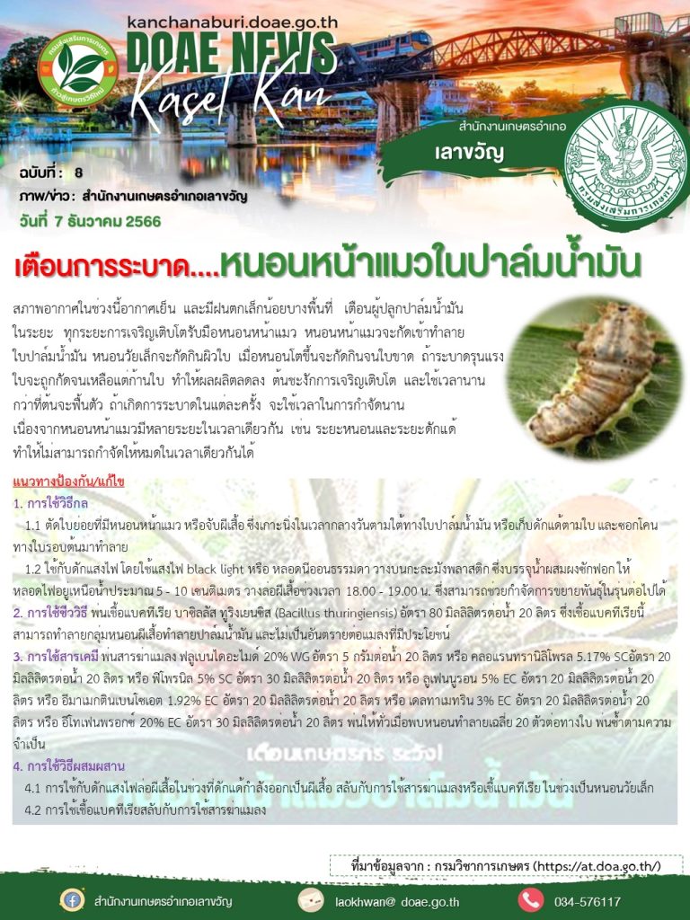3. การใช้สารเคมี พ่นสารฆ่าแมลง ฟลูเบนไดอะไมด์ 20% WG อัตรา 5 กรัมต่อน้ำ 20 ลิตร หรือ คลอแรนทรานิลิโพรล 5.17% SCอัตรา 20 มิลลิลิตรต่อน้ำ 20 ลิตร หรือ ฟิโพรนิล 5% SC อัตรา 30 มิลลิลิตรต่อน้ำ 20 ลิตร หรือ ลูเฟนนูรอน 5% EC อัตรา 20 มิลลิลิตรต่อน้ำ 20 ลิตร หรือ อีมาเมกตินเบนโซเอต 1.92% EC อัตรา 20 มิลลิลิตรต่อน้ำ 20 ลิตร หรือ เดลทาเมทริน 3% EC อัตรา 20 มิลลิลิตรต่อน้ำ 20 ลิตร หรือ อีโทเฟนพรอกซ์ 20% EC อัตรา 30 มิลลิลิตรต่อน้ำ 20 ลิตร พ่นให้ทั่วเมื่อพบหนอนทำลายเฉลี่ย 20 ตัวต่อทางใบ พ่นซ้ำตามความจำเป็น