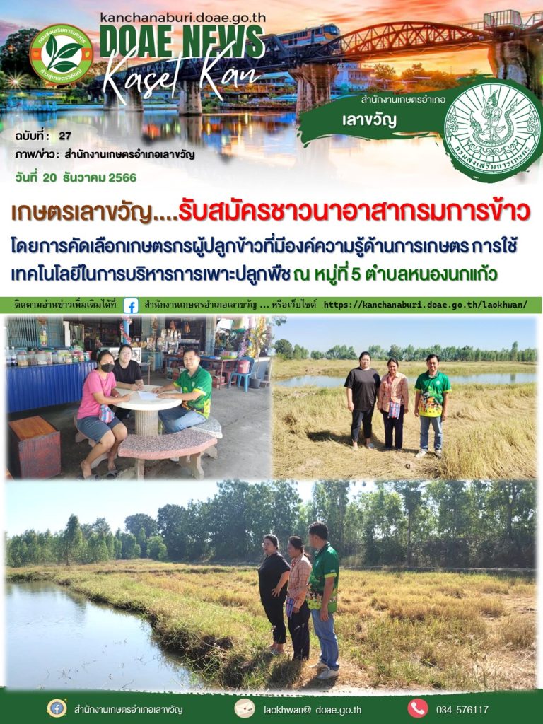 วันที่ 20 ธันวาคม 2566 สำนักงานเกษตรอำเภอเลาขวัญ โดยนายพิพัฒน์ คลาดโรค นักวิชาการส่งเสริมการเกษตร พร้อมด้วยผู้ใหญ่บ้าน ดำเนินการคัดเลือกเกษตรกรผู้ปลูกข้าวที่มีองค์ความรู้ด้านการเกษตรการใช้เทคโนโลยีในการบริหารการเพาะปลูกพืช เพื่อสมัครชาวนาอาสากรมการข้าว ณ หมู่ที่ 5 ตำบลหนองนกแก้ว อำเภอเลาขวัญ จังหวัดกาญจนบุรี