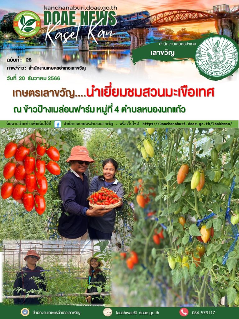 วันที่ 20 ธันวาคม 2566 สำนักงานเกษตรอำเภอเลาขวัญ โดยนางสาวระวิวรรณ เอี่ยมทอง นักวิชาการส่งเสริมการเกษตรชำนาญการ พร้อมด้วยเจ้าหน้าที่ฯ ลงพื้นที่ติดตามพร้อมเก็บข้อมูลเกษตรกรผู้ปลูกมะเขือเทศ ณ ข้าวป้างเมล่อนฟาร์ม ต.หนองนกแก้ว อ.เลาขวัญ จ.กาญจนบุรี โดยมีนายศิริชัย สามขุนทด ผู้เป็นเจ้าของ ซึ่งในช่วงนี้มะเขือเทศของฟาร์มเริ่มเก็บเกี่ยวผลผลิต ซึ่งมะเขือเทศที่เก็บผลผลิตในช่วงนี้ เป็นมะเขือเทศเชอรี่ ที่เป็นพันธุ์เฉพาะที่เหมาะสมกับพื้นที่ พร้อมทั้งมีการดูแลเอาใจใส่ทุกขั้นตอนการผลิต ทำให้ผลผลิตที่ได้มีคุณภาพดี หวาน กรอบ อร่อย เป็นที่ต้องการของลูกค้า