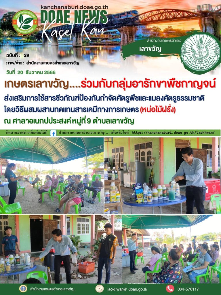 วันที่ 20 ธันวาคม 2566 สำนักงานเกษตรอำเภอเลาขวัญ โดยนายวีรธรรม ชูใจ เกษตรอำเภอเลาขวัญ ร่วมให้ความรู้กับกลุ่มเกษตรกรผู้ปลูกหน่อไม้ฝรั่งในการจัดกระบวนการถ่ายทอดความรู้ให้เกษตรกร ครั้้งที่ 1 ส่งเสริมการใช้สารชีวภัณฑ์ป้องกันกำจัดศัตรูพืชและแมลงศัตรูธรรมชาติโดยวิธีผสมผสานทดแทนสารเคมีทางการเกษตรและแนะนำอาการของโรคพืชพร้อมวิธีการดูแลรักษาโรคพร้อมสาธิตการผสมสารเคมีให้กลับกลุ่มเกษตรกร ณ ศาลาอเนกประสงค์หมู่ที่9 ตำบลเลาขวัญ อำเภอเลาขวัญทจังหวัดกาญจนบุรี