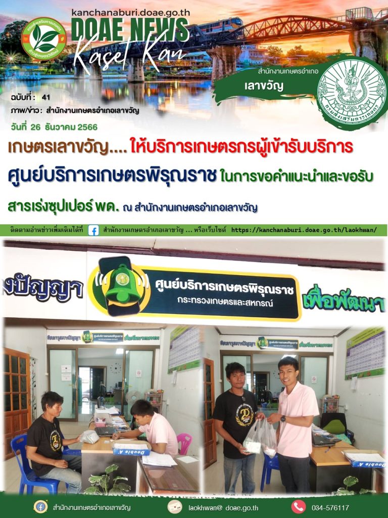 วันที่ 26 ธันวาคม 2566 เจ้าหน้าที่สำนักงานเกษตรอำเภอเลาขวัญ ให้บริการประชาชนผู้เข้ารับบริการศูนย์บริการเกษตรพิรุณราช เพื่อขอรับการสนับสนุนสารเร่งซุปเปอร์ พด.1(เป็นกลุ่มจุลินทรีย์ที่มีประสิทธิภาพสูงในการย่อยสลายวัสดุเหลือใช้จากการเกษตร และอุตสาหกรรมแปรรูป ผลผลิตทางการเกษตรเพื่อผลิตปุ๋ยหมักในเวลารวดเร็วและมีคุณภาพสูงขึ้น ประกอบด้วยเชื้อรา และแอคติโนมัยซีสที่ย่อยสารประกอบเซลลูโลส และแบคทีเรียที่ย่อยไขมัน) และสารเร่งซุปเปอร์ พด. 2 (เชื้อจุลินทรีย์ที่มี คุณสมบัติในการย่อยสลายวัสดุเหลือใช้จากพืชหรือ สัตว์ลักษณะเปียกหรือมีความชื้นสูงเพื่อผลิต ปุ๋ยอินทรีย์น้ำ โดยการดำเนินกิจกรรมการหมักใน สภาพที่ไม่มีออกซิเจนทำให้กระบวนการหมักดำเนิน ไปอย่างมีประสิทธิภาพยิ่งขึ้น) โดยได้รับการสนับสนุนจากสถานีพัฒนาที่ดินจังหวัดกาญจนบุรีเพื่อนำมาแจกให้กับเกษตรกรในพื้นที่ที่ต้องการ