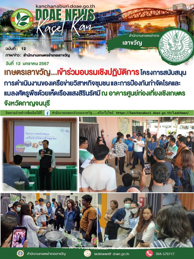 วันที่ 12 มกราคม 2567 สำนักงานเกษตรอำเภอเลาขวัญ โดยนางสาวระวิวรรณ เอี่ยมทอง นักวิชาการส่งเสริมการเกษตรชำนาญการ ผู้รับผิดชอบงานอารักขาพืชระดับอำเภอ และนายทศวรรษ แผนสมบูรณ์ นักวิชาการส่งเสริมการเกษตรปฏิบัติการ ผู้รับผิดชอบงานวิสาหกิจชุมชน เข้าร่วมการอบรมเชิงปฏิบัติการในหัวเรื่อง “แนวทางการพัฒนาทักษะและการดำเนินงานเครือข่ายวิสาหกิจชุมชน และการป้องกันกำจัดโรคและแมลงศัตรูพืชด้วยเห็ดเรืองแสงสิรินรัศมี” ภายใต้โครงการสนับสนุนการดำเนินงานของเครือข่ายวิสาหกิจชุมชนประจำปีงบประมาณ พ.ศ. 2567 โดยมีวัตถุประสงค์เพื่อสร้างความรู้ ความเข้าใจ ในการดำเนินงานด้านเครือข่ายวิสาหกิจชุมชน ให้สามารถส่งเสริมและสนับสนุนวิสาหกิจชุมชนได้อย่างมีประสิทธิภาพ และยกระดับกิจการของวิสาหกิจชุมชนและเครือข่ายวิสาหกิจชุมชนให้มีศักยภาพสูงขึ้น ณ อาคารศูนย์ท่องเที่ยวเชิงเกษตรจังหวัดกาญจนบุรี สำนักงานเกษตรจังหวัดกาญจนบุรี ตำบลปากแพรก อำเภอเมืองกาญจนบุรี จังหวัดกาญจนบุรี