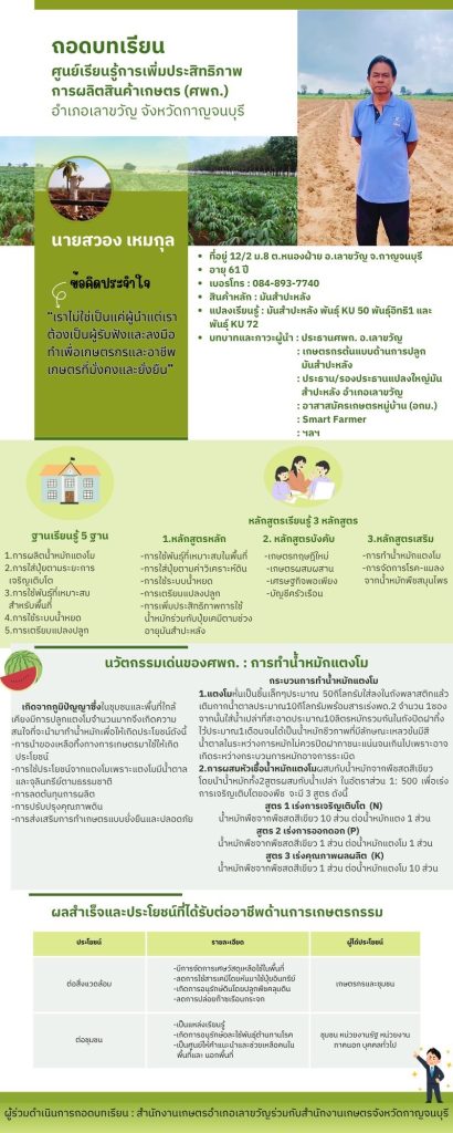1.เอกสารการถอดบทเรียน จากกระบวนการเรียนรู้ของนายสวอง เหมกุล ประธานศพก.และเกษตรกรต้นแบบด้านการปลูกมันสำปะหลัง