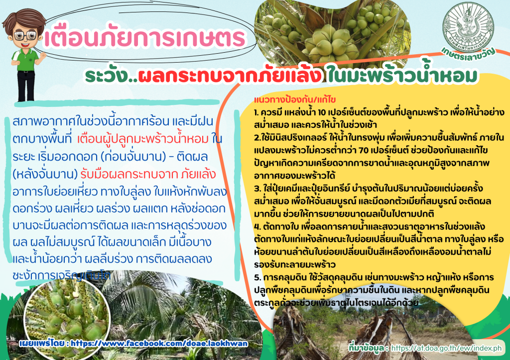 สภาพอากาศในช่วงนี้อากาศร้อน และมีฝนตกบางพื้นที่ เตือนผู้ปลูกมะพร้าวน้ำหอม ในระยะ เริ่มออกดอก (ก่อนจั่นบาน) – ติดผล (หลังจั่นบาน) รับมือผลกระทบจาก ภัยแล้ง