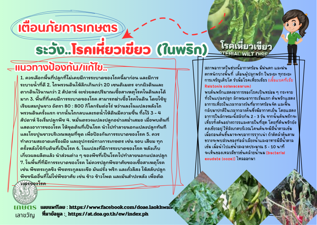 เตือนภัยเกษตรกรระวัง..โรคเหี่ยวเขียวในพริก เกิดจากเชื้อแบคทีเรีย Ralstonia solanacearum. อาการที่สำคัญคือ ต้นพริกจะแสดงอาการเหี่ยวในช่วงกลางวันที่อากาศร้อน และฟื้นตัวในเวลากลางคืน. เมื่ออาการรุนแรงขึ้น ต้นพริกจะเหี่ยวถาวรและตายในที่สุด โดยที่ต้นยังคงมีสีเขียวอยู่