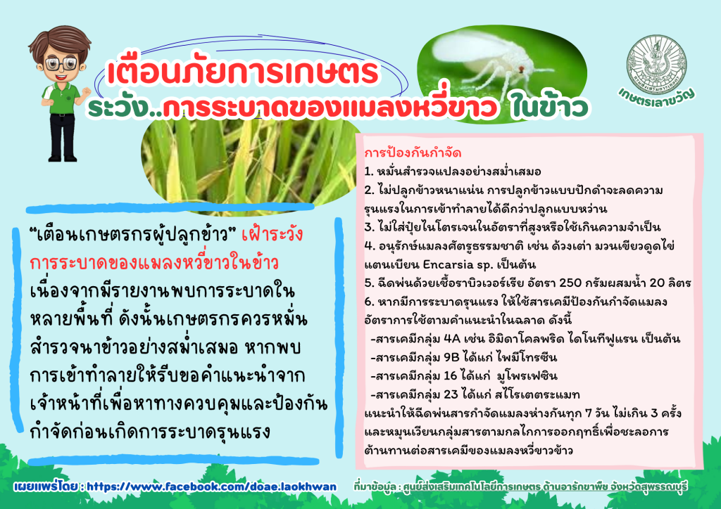 เฝ้าระวังการระบาดของแมลงหวี่ขาวในข้าว เนื่องจากมีรายงานพบการระบาดในหลายพื้นที่ ดังนั้นเกษตรกรควรหมั่นสำรวจนาข้าวอย่างสม่ำเสมอ หากพบการเข้าทำลายให้รีบขอคำแนะนำจากเจ้าหน้าที่เพื่อหาทางควบคุมและป้องกันกำจัดก่อนเกิดการระบาดรุนแรง