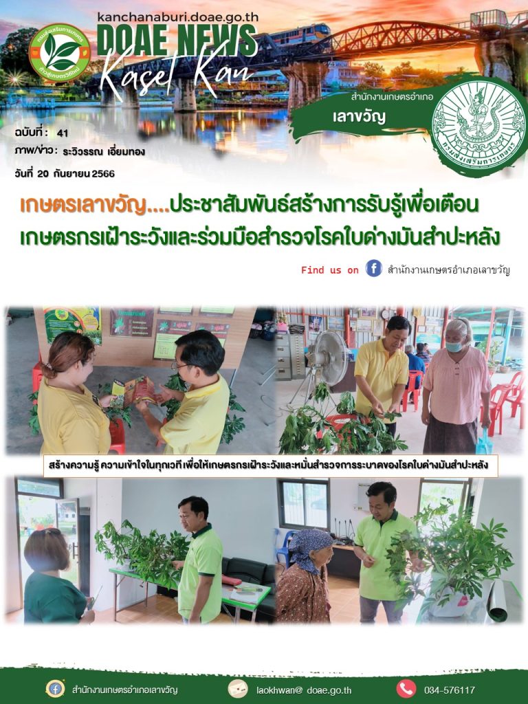 เจ้าหน้าที่สำนักงานเกษตรอำเภอเลาขวัญ ดำเนินการประชาสัมพันธ์สร้างการรับรู้ และสร้างความเข้าใจเกี่ยวกับการเฝ้าระวังโรคใบด่างมันสำปะหลังขอความร่วมมือเกษตรกรทุกท่านที่ปลูกมันสำปะหลังในพื้นที่ อ.เลาขวัญ จ.กาญจนบุรี ช่วยรายงานข้อมูลพื้นที่พบการระบาดของโรคใบด่างมันสำปะหลัง ผ่านระบบ Google Form