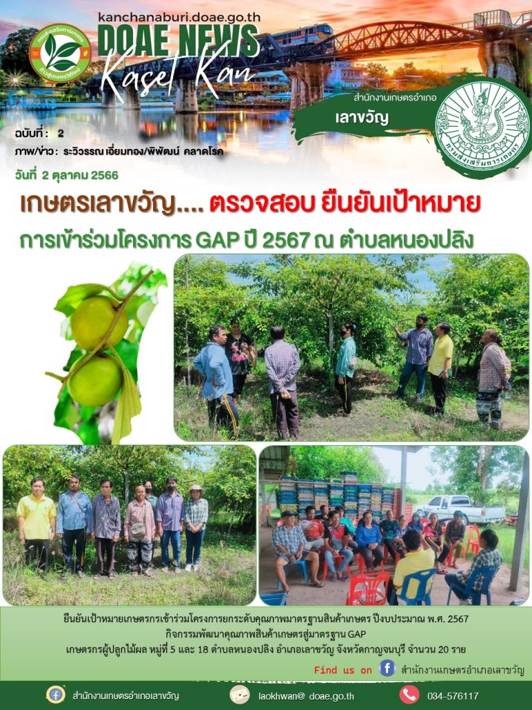วันที่ 2 ตุลาคม 2566 สำนักงานเกษตรอำเภอเลาขวัญโดยนายพิพัฒน์ คลาดโรค นักวิชาการส่งเสริมการเกษตร และนางสาวระวิวรรณ เอี่ยมทอง นักวิชาการส่งเสริมการเกษตรชำนาญการ ลงพื้นที่สำรวจตรวจสอบยืนยันเป้าหมายเกษตรกรเข้าร่วมโครงการยกระดับคุณภาพมาตรฐานสินค้าเกษตร ปีงบประมาณ พ.ศ. 2566 กิจกรรมพัฒนาคุณภาพสินค้าเกษตรสู่มาตรฐาน GAP ณ หมู่ที่ 5 ,18 ตำบลหนองปลิง อำเภอเลาขวัญ จังหวัดกาญจนบุรี เกษตรกรผู้ปลูกไม้ผล จำนวน 20 ราย