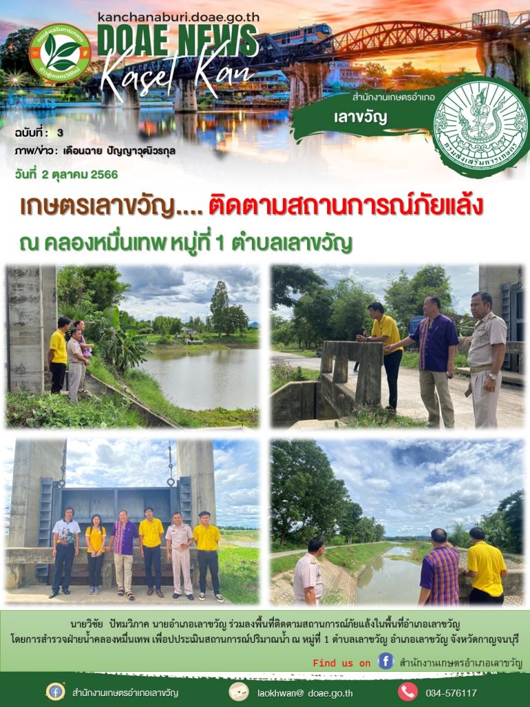 วันที่ 2 ตุลาคม 2566 นายวิชัย ปัทมวิภาค นายอำเภอเลาขวัญ พร้อมด้วยนายชยุติ โสไกร หัวหน้ากลุ่มส่งเสริมและพัฒนาการผลิต สำนักงานจังหวัดกาญจนบุรี และนายวีรธรรม ชูใจ เกษตรอำเภอเลาขวัญ ลงพื้นที่ติดตามสถานการณ์ภัยแล้งในพื้นที่อำเภอเลาขวัญ โดยการสำรวจฝายน้ำคลองหมื่นเทพ เพื่อประเมินสถานการณ์ปริมาณน้ำ ณ หมู่ที่ 1 ต.เลาขวัญ อ.เลาขวัญ จ.กาญจนบุรี