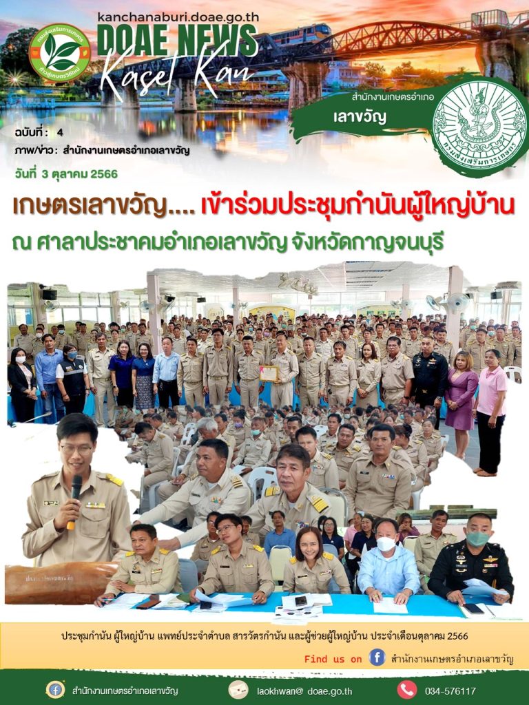 วันที่ 3 ตุลาคม 2566 นายวีรธรรม ชูใจ เกษตรอำเภอเลาขวัญ เข้าร่วมประชุมกำนัน ผู้ใหญ่บ้าน แพทย์ประจำตำบล สารวัตรกำนัน และผู้ช่วยผู้ใหญ่บ้าน ประจำเดือนตุลาคม 2566 ณ ศาลาประชาคมอำเภอเลาขวัญ จังหวัดกาญจนบุรี