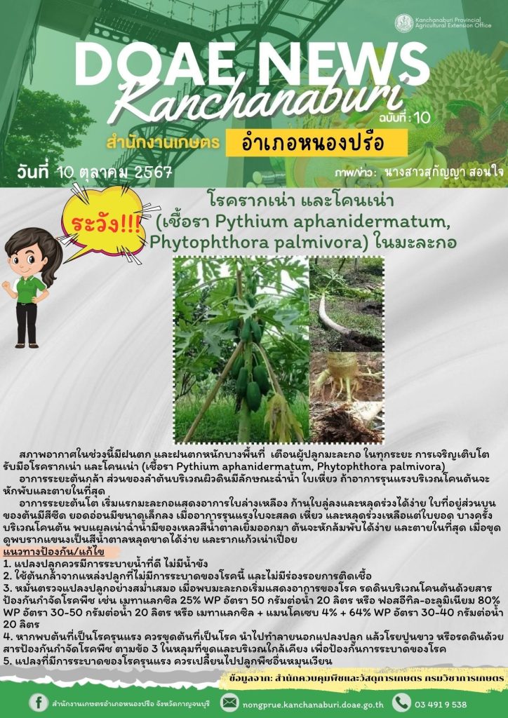 สภาพอากาศในช่วงนี้มีฝนตก และฝนตกหนักบางพื้นที่ เตือนผู้ปลูกมะละกอ ในทุกระยะ การเจริญเติบโต รับมือโรครากเน่า และโคนเน่า (เชื้อรา Pythium aphanidermatum, Phytophthora palmivora)