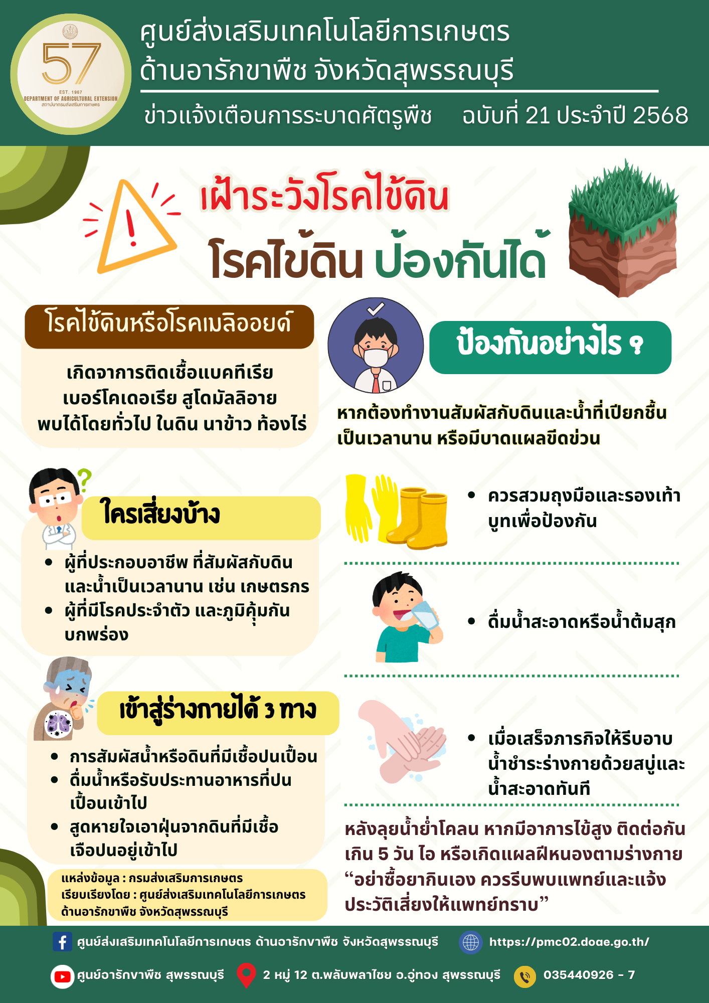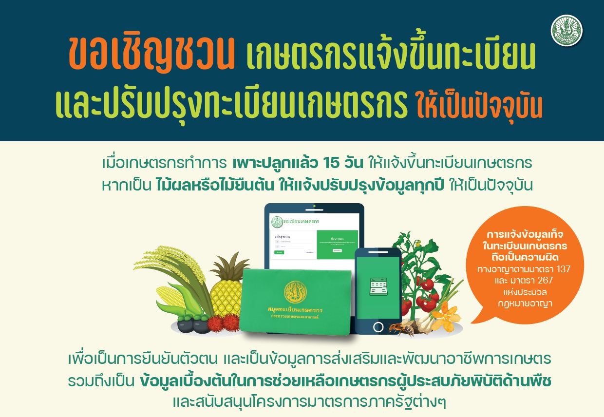 ขอประชาสัมพันธ์เกษตรกรในพื้นที่ แจ้งขึ้นทะเบียนและปรับปรุงทะเบียนเกษตรกร ประจำปี 2568/69 ให้เป็นปัจจุบัน หากเกษตรกรท่านใดไม่มีการปรับปรุงสถานภาพติดต่อกันเป็นเวลา 3 ปี จะสิ้นสถานภาพการเป็นเกษตรกร ติดต่อสอบถามข้อมูลเพิ่มเติมได้ที่ โทร. 034-591022 ในวันและเวลาราชการ