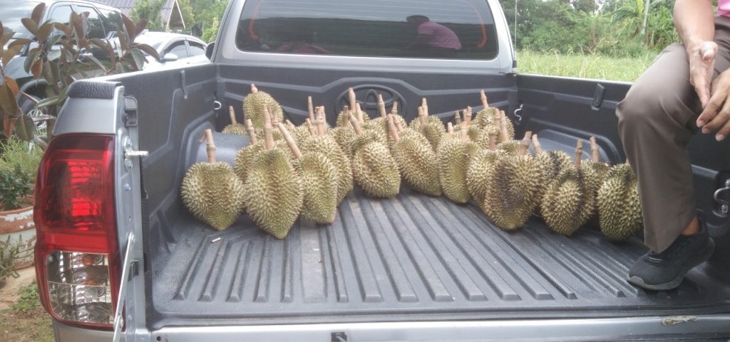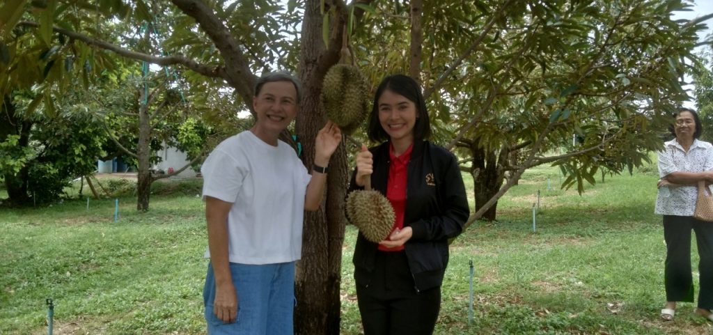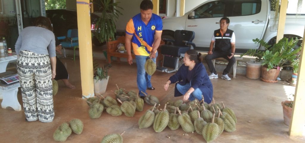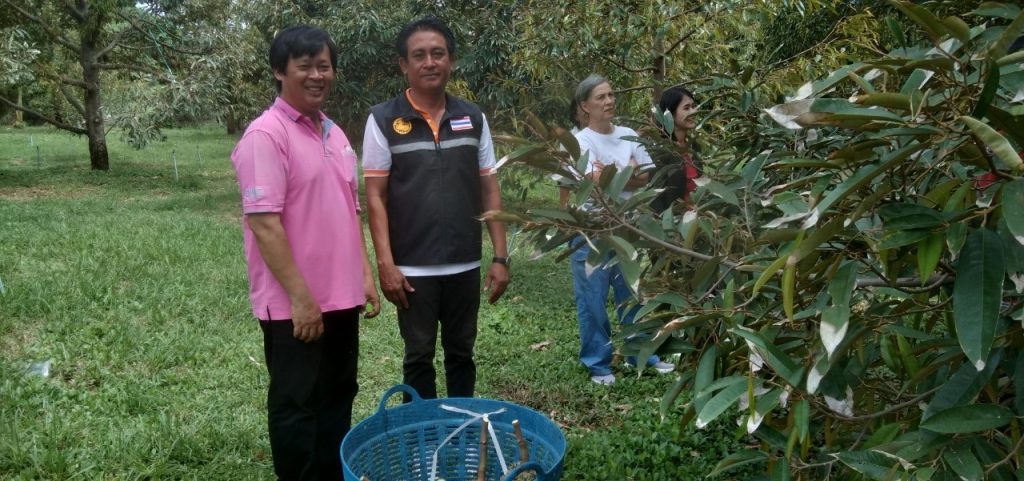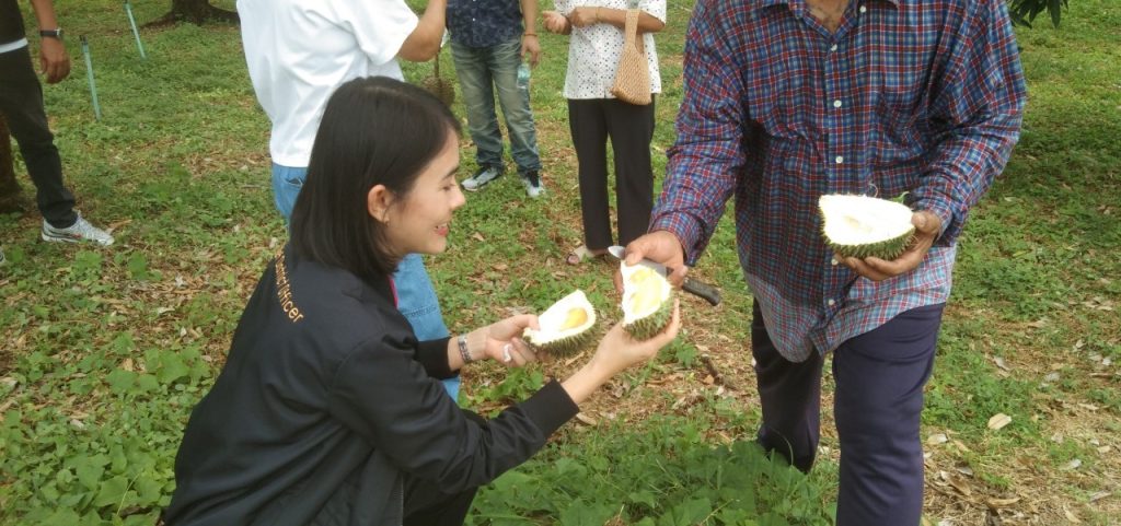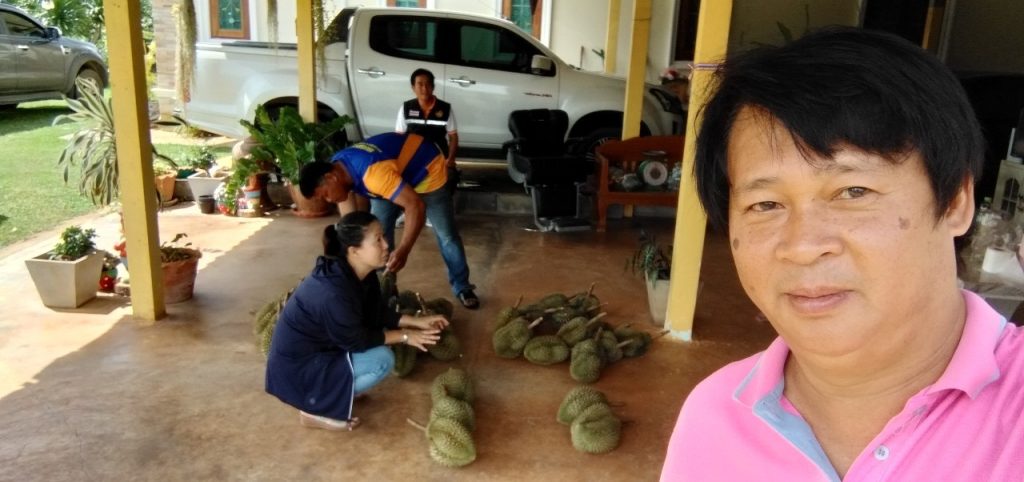นิตย์ประเสริฐ นักวิชาการส่งเสริมการเกษตรชำนาญการพิเศษ ต้อนรับนางอรทัย วงศ์วัชรมงคล นายอำเภอท่ามะกา และคณะ เพื่อเยี่ยมชมสวนทุเรียนลุงตุ๋ย ในพื้นที่หมู่ที่ 8 ตำบลโคกตะบอง อำเภอท่ามะกา จังหวัดกาญจนบุรี ซึ่งเป็นช่วงที่ทางสวนกำลังเก็บผลผลิตทุเรียนออกจำหน่าย โดยในปีนี้ผลผลิตจะน้อยกว่าในรอบหลายปีที่ผ่านมา เนื่องจากได้รับผลกระทบจากสภาพอากาศที่ร้อนจัด ทำให้ผลอ่อนหลุดร่วง ผลแตกคาต้นจำนวนมาก จากการสอบถามราคาทุเรียนหมอนทองหน้าสวนกิโลกรัมละ 250 บาท และจะเก็บผลผลิตหมดภายในเดือนนี้