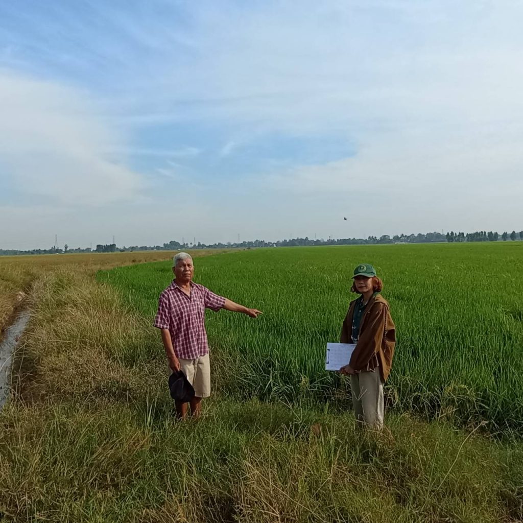 ฤทธิ์ดี นักวิชาการส่งเสริมการเกษตรชำนาญการ ดำเนินการตรวจสอบพื้นที่เพาะปลูกข้าวนาปี 2567/68 ในพื้นที่หมู่ที่ 10 ตำบลตะคร้ำเอน อำเภอท่ามะกา จังหวัดกาญจนบุรี จากการตรวจสอบพบว่าเป็นเกษตรกรปลูกข้าวจริงตามที่ได้แจ้งขึ้นทะเบียนไว้และในพื้นที่อยู่ในช่วงโครงการซ่อมคลองชลประทานฯ ทำให้เกษตรกรปลูกข้าวนาปีล่าช้ากว่าปกติ ทั้งนี้แนะนำให้เกษตรกรสำรวจแปลงนาอย่างสม่ำเสมอเพื่อป้องกันโรคเมล็ดด่าง พบมากในเขตชลประทาน เป็นการทำลายของเชื้อรามักจะปรากฏเด่นชัดในระยะใกล้เก็บเกี่ยว ซึ่งจะทำให้เกิดความเสียหายแก่ผลผลิตของเกษตรกร
