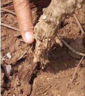 4. ก่อนปลูกแช่ท่อนพันธุ์ด้วยสาร เมทาแลกซิล 25% WP อัตรา 20-50 กรัมต่อน้ำ 20 ลิตร หรือ ฟอสอีทิล-อะลูมิเนียม 80% WP อัตรา 50 กรัมต่อน้ำ 20 ลิตร เป็นเวลา 10 นาที