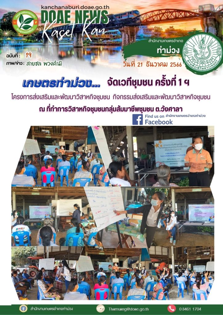 นางสาวกวินทรากานต์ มาลัยทองแก้วสุภา เกษตรอำเภอท่าม่วง พร้อมด้วยเจ้าหน้าที่สำนักงานเกษตรอำเภอท่าม่วง ดำเนินการจัดเวทีชุมชน ครั้งที่ 1 การยกระดับศักยภาพวิสาหกิจชุมชนจากระดับปรับปรุงเป็นระดับปานกลาง ตามโครงการส่งเสริมและพัฒนาวิสาหกิจชุมชน กิจกรรมส่งเสริมและพัฒนาวิสาหกิจชุมชน โดยมีสมาชิกวิสาหกิจชุมชนเข้าร่วม จำนวน 11 ราย เจ้าหน้าที่ได้ชี้แจงโครงการ/กิจกรรมส่งเสริมและพัฒนาวิสาหกิจชุมชน การดำเนินงานวิสาหกิจชุมชนอำเภอท่าม่วง มีการแลกเปลี่ยนเรียนรู้ร่วมกัน และสมาชิกวิสาหกิจชุมชนได้ร่วมกันประเมินศักยภาพ และระดมความคิดวิเคราะห์จัดทำแผนพัฒนากิจการ โดยสมาชิกวิสาหกิจชุมชนเข้าใจหลักการและวิธีการประเมินศักยภาพ รับทราบความเข้มแข็งของกลุ่ม สามารถร่วมกันจัดทำแผนเพื่อการพัฒนากิจการวิสาหกิจชุมชน ซึ่งก่อให้เกิดประโยชน์ต่อการยกระดับศักยภาพวิสาหกิจชุมชนให้อยู่ในระดับที่สูงขึ้น และสร้างความเข้มแข็งให้กับวิสาหกิจชุมชนได้ ณ ที่ทำการวิสาหกิจชุมชนกลุ่มสัมมาชีพชุมชน ต.วังศาลา อ.ท่าม่วง จ.กาญจนบุรี
