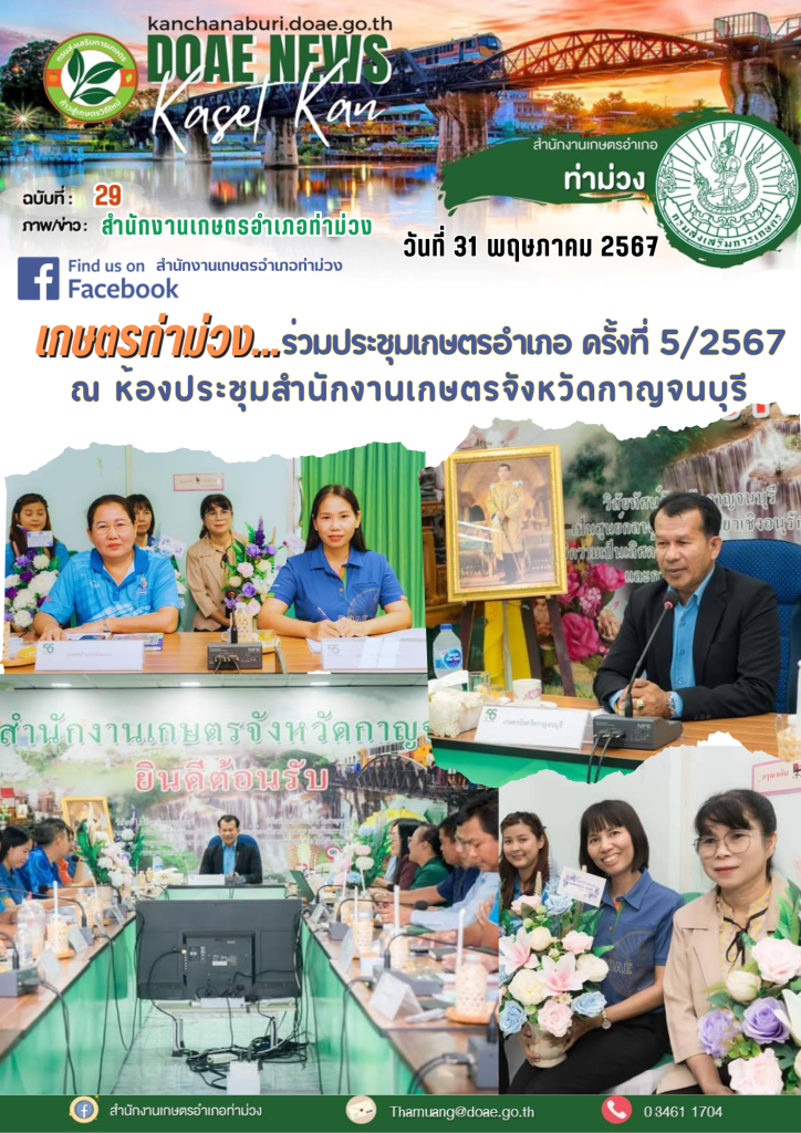 นางประภาพรรณ สุนทรวิภาต เกษตรอำเภอท่าม่วง เข้าร่วมประชุมเกษตรอำเภอ ครั้งที่ 5/2567 เพื่อรายงานผลการดำเนินงานในรอบเดือนที่ผ่านมา และรับนโยบายและแนวทางในการดำเนินงานเพื่อให้งานประสบผลสำเร็จตามเป้าหมายที่วางไว้ โดยมีนายวีระศักดิ์ สุขทอง เกษตรจังหวัดกาญจนบุรี เป็นประธานประชุมเกษตรอำเภอ ซึ่งในการประชุมในครั้งนี้มีหัวหน้ากลุ่ม/ฝ่าย เกษตรอำเภอ และเจ้าหน้าที่ ร่วมประชุมดังกล่าว ณ ห้องประชุมสำนักงานเกษตรจังหวัดกาญจนบุรี