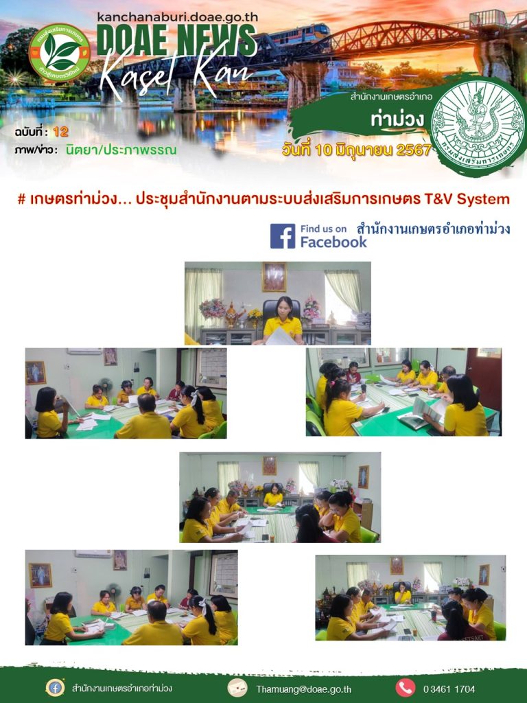 วันที่ 10 มิถุนายน 2567 นางประภาพรรณ สุนทรวิภาต เกษตรอำเภอท่าม่วง พร้อมเจ้าหน้าที่สำนักงานเกษตรอำเภอท่าม่วง ประชุมสำนักงานตามระบบส่งเสริมการเกษตร T&V System โดยมีการสรุปผลการดำเนินงานที่ผ่านมา และวางแผนการปฏิบัติงานโครงการส่งเสริมการเกษตรประจำปีงบประมาณ พ.ศ. 2567 (โครงการตามตัวชีัวัด) ครั้งที่ 2 เพื่อให้การดำเนินงานโครงการเป็นไปตามเป้าหมายที่กำหนดไว้ ณ ห้องประชุมสำนักงานเกษตรอำเภอท่าม่วง อำเภอท่าม่วง จังหวัดกาญจนบุรี