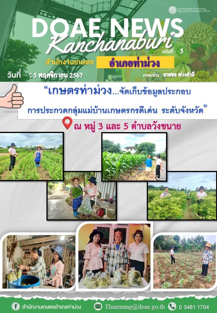 สำนักงานเกษตรอำเภอท่าม่วง โดยนางประภาพรรณ สุนทรวิภาต เกษตรอำเภอท่าม่วง พร้อมด้วย นางสาวสายชล พ่วงคำมี นักวิชาการส่งเสริมการเกษตรชำนาญการ ลงพื้นที่จัดเก็บข้อมูลประกอบการจัดทำเอกสารการคัดเลือกกลุ่มแม่บ้านเกษตรกรดีเด่นระดับจังหวัด ประจำปี 2568 ได้แก่ กลุ่มแม่บ้านเกษตรกรวังขนาย ณ แปลงปลูกพืชผักของเกษตรกร หมู่ 3 และ 5 ตำบลวังขนาย อำเภอท่าม่วง จังหวัดกาญจนบุรี ซึ่งกลุ่มบ้านเกษตรกรนี้ปลูกพืชผักหลากหลายชนิดหมุนเวียนตลอดทั้งปี เช่น ผักกาดหอม ผักกาดเขียวปลี ผักกาดขาวปลี กะเพรา ข้าวโพดฝักอ่อน พริกขี้หนู ถั่วฝักยาวไร้ค้าง เป็นต้น โดยจำหน่ายด้วยตนเอง ส่งพ่อค้าคนกลาง และนำมาแปรรูปเพิ่มมูลค่าจำหน่ายในชุมชนสร้างรายได้เสริม ลดรายจ่ายในครัวเรือนมีแบ่งปันกัน ทั้งยังสามารถพึ่งพาตนเองได้และอยู่อย่างพอเพียงอีกด้วย