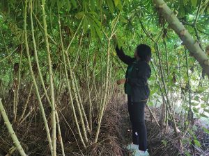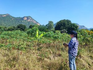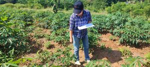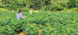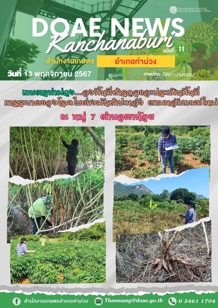 สำนักงานเกษตรอำเภอท่าม่วง โดยนางประภาพรรณ สุนทรวิภาต เกษตรอำเภอท่าม่วง มอบหมายให้นางสาวอรอุมา สังข์กลิ่นหอม นักวิชาการส่งเสริมการเกษตรชำนาญการ นางสาวนิตยา ปานธรรม นักวิชาการส่งเริมการเกษตรชำนาญการ และ จ.ส.ต.ประทีป แก้วดวงแข นักวิชาการส่งเสริมการเกษตรชำนาญการ ลงพื้นที่สำรวจและประเมินพื้นที่การระบาดของโรคใบด่างมันสำปะหลัง ตามหลักเกณฑ์ใหม่ โดยการสุ่มสำรวจแปลงเกษตรกรตัวอย่างจำนวน 5 ราย แบ่งเป็นแปลงขนาดเล็ก 4 ราย และแปลงขนาดกลาง 1 ราย โดยแปลงขนาดเล็กที่ดำเนินการสำรวจ มีพื้นที่ปลูก 10.75 ไร่ ผลการสำรวจและประเมิน พบว่า มีการระบาดของโรคใบด่างมันสำปะหลัง จำนวน 1 แปลง พื้นที่จำนวน 4 ไร่ ซึ่งมันสำปะหลังอายุประมาณ 4 เดือน และแปลงขนาดกลาง จำนวน 1 แปลง พื้นที่ปลูก 11.25 ไร่ ผลการสำรวจและประเมิน พบว่า มีการระบาดของโรคใบด่างมันสำปะหลังกระจายทั่วทั้งแปลง ซึ่งมันสำปะหลังอายุประมาณ 7 เดือน ทั้งนี้ได้แจ้งให้เกษตรกรรับทราบและให้คำแนะนำในการกำจัดออกนอกพื้นที่หลังการเก็บเกี่ยว และไม่นำท่อนพันธุ์แปลงที่ระบาดของโรคใบด่างมันสำปะหลังมาปลูกขยายพันธุ์ในฤดูกาลต่อไป เพื่อลดการระบาดของโรคใบด่างมันสำปะหลังในพื้นที่ หมู่ 7 ตำบลเขาน้อย อำเภอท่าม่วง จังหวัดกาญจนบุรี