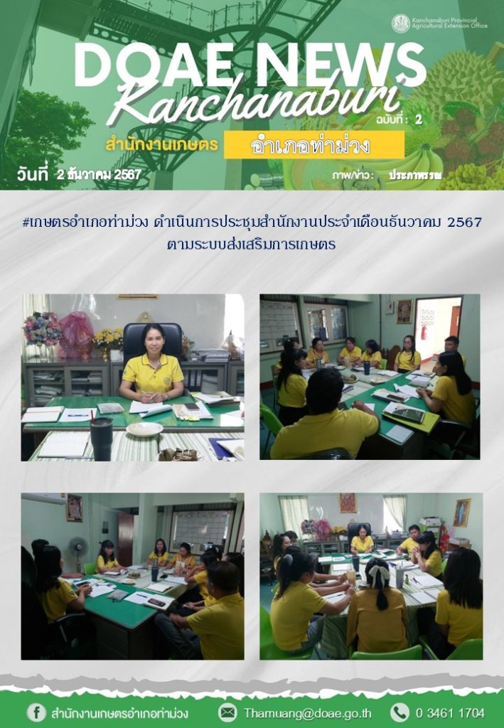 สำนักงานเกษตรอำเภอท่าม่วง โดนนางประภาพรรณ สุนทรวิภาต เกษตรอำเภอท่าม่วง พร้อมเจ้าหน้าที่ ดำเนินการประชุมสำนักงานประจำเดือนธันวาคม 2567 ตามระบบส่งเสริมการเกษตร เพื่อสรุปผลการดำเนินงานที่ผ่านมา สอบถามปัญหาอุปสรรคและแนวทางการแก้ไข พร้อมวางแผนปฏิบัติงานตามโครงการส่งเสริมการเกษตร ประจำปีงบประมาณ พ.ศ. 2568 (โครงการตามตัวชี้วัด) ครั้งที่ 1 เพื่อให้สามารถดำเนินการได้ตามเป้าหมายมีการเบิกจ่ายตามกำหนดเวลา ณ ห้องประชุมสำนักงานเกษตรอำเภอท่าม่วง จังหวัดกาญจนบุรี