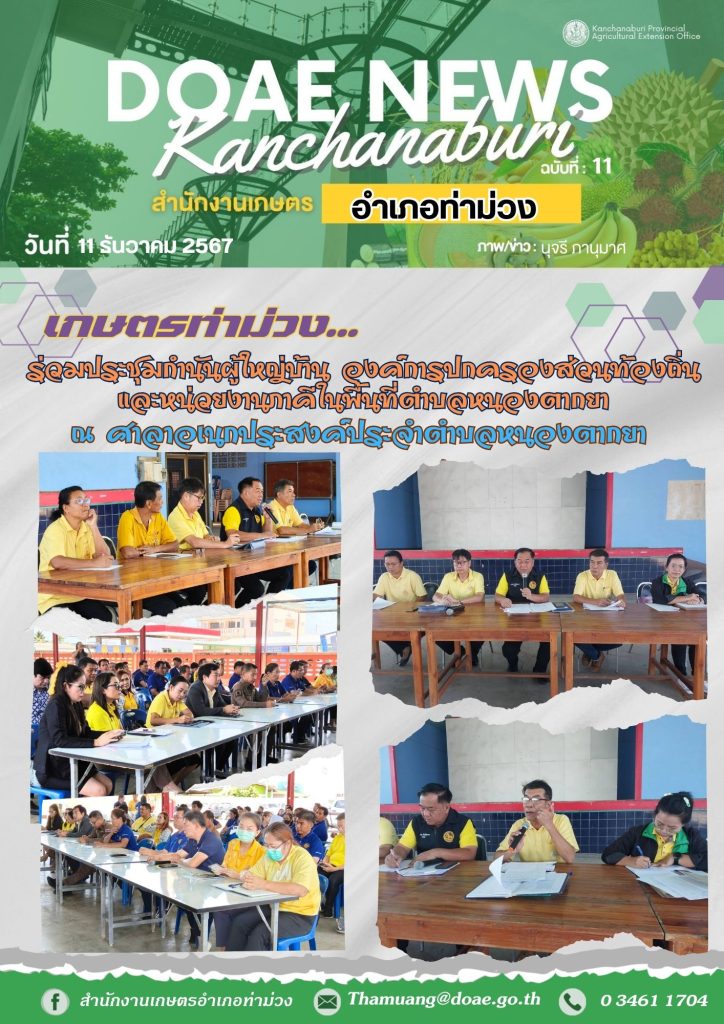 สำนักงานเกษตรอำเภอท่าม่วง โดยนางประภาพรรณ สุนทรวิภาต เกษตรอำเภอท่าม่วง มอบหมายให้นางนุจรี ภานุมาศ นักวิชาการส่งเสริมการเกษตรชำนาญการ และนายประจักร์ รัตนวรกมล เจ้าพนักงานการเกษตรชำนาญงาน ร่วมประชุม กำนัน ผู้ใหญ่บ้าน เจ้าหน้าที่องค์การปกครองส่วนท้องถิ่น และหน่วยงานภาคีในพื้นที่ตำบลหนองตากยา โดยเจ้าหน้าที่ได้แจ้งข้อมูลผลการช่วยเหลือเกษตรกรผู้ประสบภัยธรรมชาติ พร้อมทั้งแจ้งแผนการปฏิบัติงานของหน่วยงานที่มีโครงการลงปฏิบัติงานในพื้นที่ให้ผู้นำชุมชนได้รับทราบ ณ ศาลาอเนกประสงค์ประจำตำบล (ศาลเจ้าแปะกง) ตำบลหนองตากยา อำเภอท่าม่วง จังหวัดกาญจนบุรี