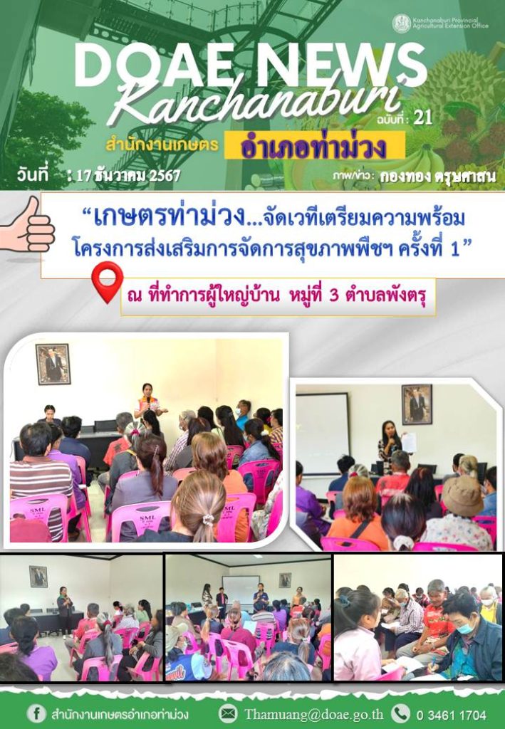 สำนักงานเกษตรอำเภอท่าม่วง โดยนางประภาพรรณ สุนทรวิภาต เกษตรอำเภอท่าม่วง พร้อมด้วยเจ้าหน้าที่สำนักงานเกษตรอำเภอท่าม่วง ร่วมกับเจ้าหน้าที่กลุ่มอารักขาพืช สำนักงานเกษตรจังหวัดกาญจนบุรี ดำเนินการจัดเวทีสอบถามความต้องการและเตรียมความพร้อมในการดำเนินโครงการส่งเสริมการจัดการสุขภาพพืช เพื่อเพิ่มประสิทธิภาพการผลิตสินค้าเกษตร (ครั้งที่ 1) เพื่อชี้แจงวัตถุประสงค์การดำเนินโครงการฯ เตรียมความพร้อมก่อนอบรม พร้อมทั้งให้เกษตรกรจัดทำแบบประเมินพฤติกรรม/ต้นทุนเกษตรกรก่อนเข้ารับการอบรม พร้อมสอบถามปัญหาความต้องการเพื่อจัดทำหลักสูตรในการอบรมถ่ายทอดความรู้ในเวทีที่ 2 เพื่อให้ได้หลักสูตรที่ตรงตามความต้องการของพื้นที่อย่างแท้จริง โดยมีเป้าหมายเกษตรกรผู้ปลูกข้าวโพดฝักอ่อน ของตำบลพังตรุ ตำบลท่าตะคร้อ และตำบลบ้านใหม่ จำนวน 32 ราย ทั้งนี้ จากการสอบถามปัญหาและความต้องการ เกษตรกรสนใจในการอบรมหลักสูตรการจัดการศัตรูพืชแบบผสมผสาน IPM และการใช้สารเคมีอย่างถูกต้องและปลอดภัย อีกทั้งเจ้าหน้าที่ได้นัดหมายการอบรมในครั้งที่ 2 ในวันที่ 27 ธันวาคม 2567 พร้อมมอบหมายให้เกษตรกรเก็บตัวย่างดินแปลงของตนเองมาเพื่อตรวจวิเคราะห์ปริมาณธาตุอาหารในดิน และเก็บตัวอย่างผลผลิต จำนวน 10 ตัวอย่างเพื่อวิเคราะห์ปริมาณสารพิษตกค้างในผลผลิต เพื่อนำผลที่ได้มาเป็นข้อมูลในการอบรมต่อไป