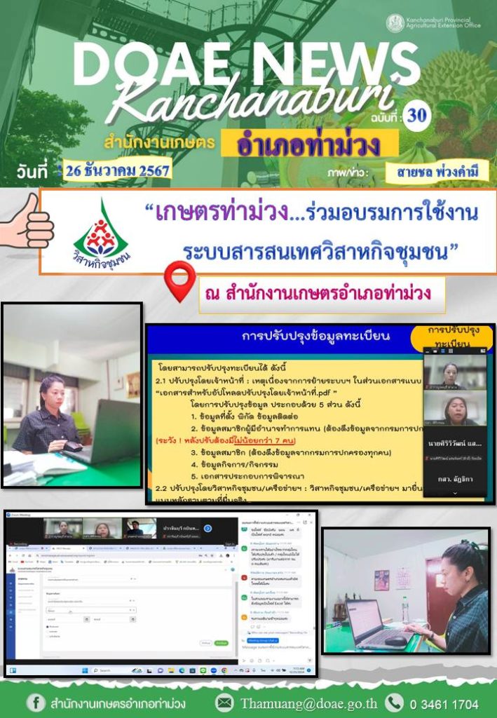 วันที่ 25 ธันวาคม 2567 สำนักงานเกษตรอำเภอท่าม่วง โดยนางประภาพรรณ สุนทรวิภาต เกษตรอำเภอท่าม่วง มอบหมายให้นางสาวสายชล พ่วงคำมี นักวิชาการส่งเสริมการเกษตรชำนาญการ เข้าร่วมอบรมการใช้งานระบบสารสนเทศวิสาหกิจชุมชน ซึ่งเป็นการเรียนรู้และฝึกปฏิบัติการใช้งานระบบสารสนเทศวิสาหกิจชุมชนในการปรับปรุงข้อมูลทะเบียนและการต่อทะเบียนวิสาหกิจชุมชนประจำปี 2568 เป็นการสร้างการรับรู้ ความเข้าใจ และการแก้ไขปัญหาในการใช้งานระบบของเจ้าหน้าที่ในระดับปฏิบัติงานได้อย่างถูกต้องและเป็นไปในทิศทางเดียวกัน ในรูปแบบออนไลน์ผ่านระบบ Zoom meeting ณ สำนักงานเกษตรอำเภอท่าม่วง จังหวัดกาญจนบุรี