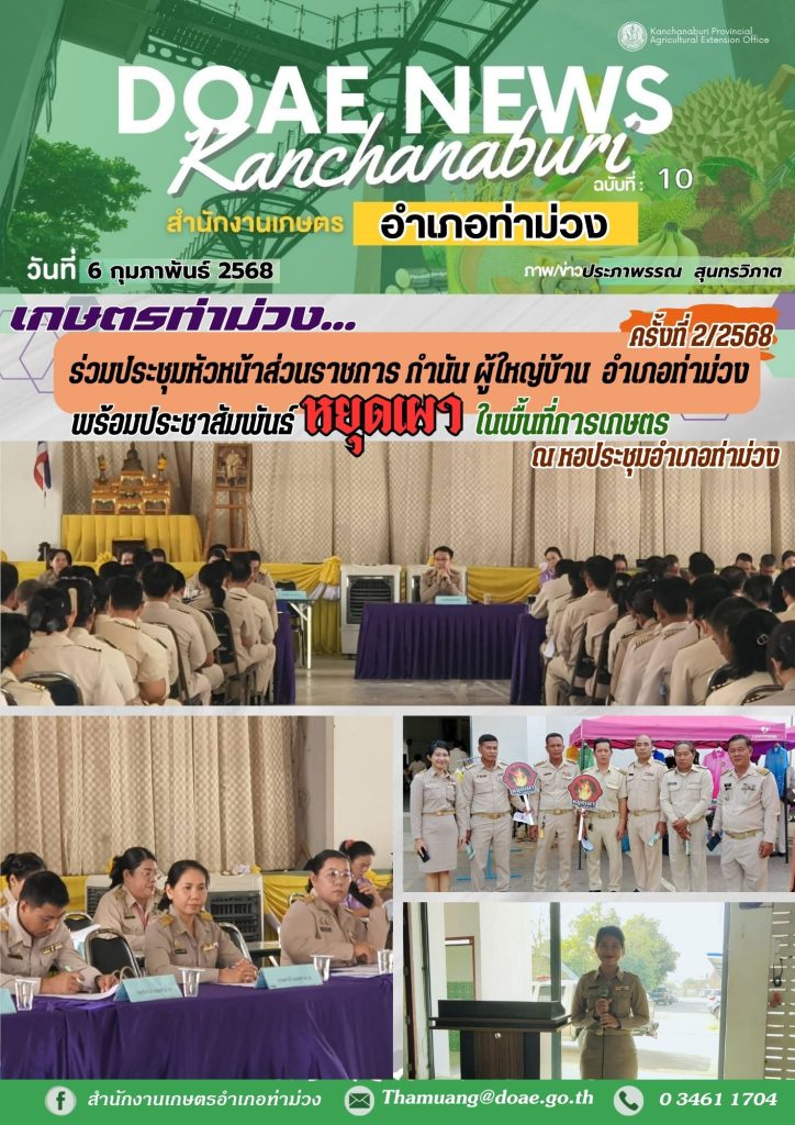 วันที่ 6 กุมภาพันธ์ 2568 นางประภาพรรณ สุนทรวิภาต เกษตรอำเภอท่าม่วง เข้าร่วมประชุมหัวหน้าส่วนราชการอำเภอท่าม่วง กำนัน ผู้ใหญ่บ้านฯ ครั้งที่ 2/2568 ประจำเดือนกุมภาพันธ์ เพื่อรับนโยบาย ข้อราชการสำคัญและแนวทางการปฏิบัติงาน โดยมีนายนพพล สุกิจปาณีนิจ นายอำเภอท่าม่วง เป็นประธานในการประชุม ทั้งนี้สำนักงานเกษตรอำเภอท่าม่วง ได้ชี้แจงประกาศของกระทรวงเกษตรและสหกรณ์ เรื่อง มาตรการการบริหารจัดการป้องกันและแก้ไขปัญหาฝุ่นละอองขนาดเล็กไม่เกิน 2.5 ไมครอน (PM2.5) ในกรณีเกษตรกรรายใดมีประวัติการเผาในพื้นที่การเกษตร ตั้งแต่วันที่ 17 มกราคม – 31 พฤษภาคม 2568 จะไม่ได้รับสิทธิ์ในการเข้าร่วมโครงการสนับสนุนและพัฒนาศักยภาพเกษตรกรทุกโครงการ นับตั้งแต่ 1 มิถุนายน 2567 ถึง 31 พฤษภาคม 2570 (ถูกตัดสิทธิ์เป็นระยะเวลา 2 ปี) พร้อมทั้งแนะนำข้าราชการใหม่ที่ย้ายมาปฏิบัติงาน นางสาวทิพวรรณ สิทธิสมบัติ นักวิชาการส่งเสริมการเกษตรปฏิบัติการ