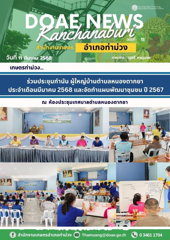 สำนักงานเกษตรอำเภอท่าม่วง โดยนางประภาพรรณ สุนทรวิภาต เกษตรอำเภอท่าม่วง มอบหมายให้ นางนุจรี ภานุมาศ นักวิชาการส่งเสริมการเกษตรชำนาญการ และนายประจักร์ รัตนวรกมล เจ้าพนักงานการเกษตรชำนาญงาน เข้าร่วมประชุมผู้ใหญ่บ้าน ผู้ช่วยผู้ใหญ่บ้าน สารวัตกำนัน แพทย์ประจำตำบล สมาชิกสภาท้องถิ่น ผู้บริหารส่วนท้องถิ่น หัวหน้าส่วนราชการ ประจำเดือนมีนาคม 2568 ณ ห้องประชุมเทศบาลตำบลหนองตากยา อำเภอท่าม่วง จังหวัดกาญจนบุรี โดยเจ้าหน้าที่ได้ประชาสัมพันธ์การขึ้นทะเบียนเกษตรกรและปรับปรุงข้อมูลทะเบียนเกษตรกร ปี 2568 แจ้งรณรงค์เรื่องการหยุดเผาในพื้นที่การเกษตรตามประกาศกระทรวงเกษตรและสหกรณ์ เรื่อง มาตรการบริหารการจัดการป้องกันและแก้ไขปัญหาฝุ่นละอองขนาดเล็กไม่เกิน 2.5 ไมครอน (PM2.5) ภาคการเกษตร ชี้แจงการดำเนินงานโครงการขับเคลื่อนการเกษตรระดับหมู่บ้านสู่การผลิตสินค้าเกษตรมูลค่าสูง การขับเคลื่อนงานการเกษตร 1 เกษตรตำบล 1 สินค้าเกษตรมูลค่าสูง และร่วมรับทราบปัญหาและตอบข้อซักถามด้านการเกษตรในพื้นที่ พร้อมทั้งร่วมกับทางเจ้าหน้าที่พัฒนาชุุมชนอำเภอท่าม่วง ผู้นำชุมชนทั้ง 16 หมู่บ้าน ปลัดอำเภอท่าม่วง และ ผู้บริหารส่วนท้องถิ่น จัดทำแผนพัฒนาชุมชนตำบลหนองตากยา ประจำปี 2567 ทั้งนี้เจ้าหน้าที่ได้เสนอโครงการพัฒนาผลผลิตทางด้านการเกษตรของกลุ่มเกษตกรในพื้นที่ และโครงการขับเคลื่อนการเกษตรระดับหมู่บ้านสู่การผลิตสินค้าเกษตรมูลค่าสูง เข้าบรรจุในแผนพัฒนาชุมชน ในครั้งนี้ด้วย