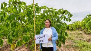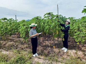 สำนักงานเกษตรอำเภอท่าม่วง โดย นางประภาพรรณ สุนทรวิภาต เกษตรอำเภอท่าม่วง พร้อมด้วยเจ้าหน้าที่สำนักงานเกษตรอำเภอท่าม่วง ร่วมกับเกษตรกรต้นแบบ ลงพื้นที่จัดเก็บข้อมูลโครงการส่งเสริมการขยายพันธุ์และการปลูกมันสำปะหลังพันธุ์ต้านทานโรคใบด่างมันสำปะหลังเพื่อลดความรุนแรงของโรคใบด่างมันสำปะหลังในประเทศไทย เพื่อติดตามการดำเนินงานแปลงมันสำปะหลังของเกษตรกรต้นแบบที่ได้รับการสนับสนุนท่อนพันธุ์มันสำปะหลังพันธุ์อิทธิ 1 ของนายสมเกียรติ อยู่วิลัย พื้นที่ 1 ไร่ และอิทธิ 3 ของนางวนิดา กิจสมัคร พื้นที่ 1 ไร่ ช่วงอายุมันสำปะหลัง หลังการเพาะปลูก 6 เดือน พร้อมสุ่มวัดความสูงของลำต้นและความกว้างของทรงพุ่ม จำนวน 20 ต้นต่อแปลง จัดเก็บข้อมูลการดูแลรักษาการ ใส่ปุ๋ย การใช้สารกำจัดวัชพืช รวมทั้งการสำรวจการระบาดของศัตรูพืชในแปลง และสำรวจโรคแมลงศัตรูพืช จากการลงพื้นที่พบว่าแปลงมันสำปะหลังพันธุ์อิทธิ 1 พบการระบาดของโรคใบด่างมันสำปะหลัง จำนวน 6 ต้น พบแมลงหวี่ขาวใยเกลียว และเพลี้ยแป้งมันสำปะหลัง กระจายทั่วทั้งแปลง ส่วนแปลงมันสำปะหลังพันธุ์อิทธิ 3 ไม่พบการระบาดของโรคใบด่างมันสำปะหลังแต่พบแมลงหวี่ขาวใยเกลียวและเพลี้ยแป้งมันสำปะหลังกระจายทั่วทั้งแปลง เจ้าหน้าที่จึงให้คำแนะนำเกษตรกรหมั่นสำรวจแปลงของตนเองอย่างสม่ำเสมอ และให้คำแนะนำในการป้องกันกำจัดศัตรูพืชอย่างถูกวิธี และรายงานผลให้ทางสำนักงานเกษตรจังหวัดกาญจนบุรีทราบต่อไป ณ หมู่ที่ 5 ตำบลรางสาลี่ อำเภอท่าม่วง จังหวัดกาญจนบุรี