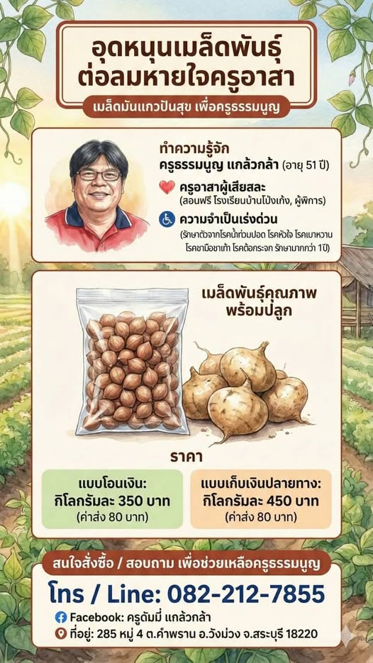 นอกจากจะได้เมล็ดพันธุ์ ท่านยังได้ช่วยสมทบทุนค่ารักษาพยาบาล (โรคหัวใจ/น้ำท่วมปอด) ให้คุณครูได้มีทุนรักษาตัวต่อไปด้วยครับ ![]()