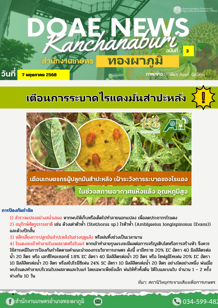 Post Views: 139 Facebook iconFacebookTwitter iconTwitterLINE iconLine Post navigation เกษตรทองผาภูมิ เตือนการระบาดราแป้งในมะม่วง เกษตรทองผาภูมิ เตือนการระบาดเพลี้ยหอยเกล็ดขาว