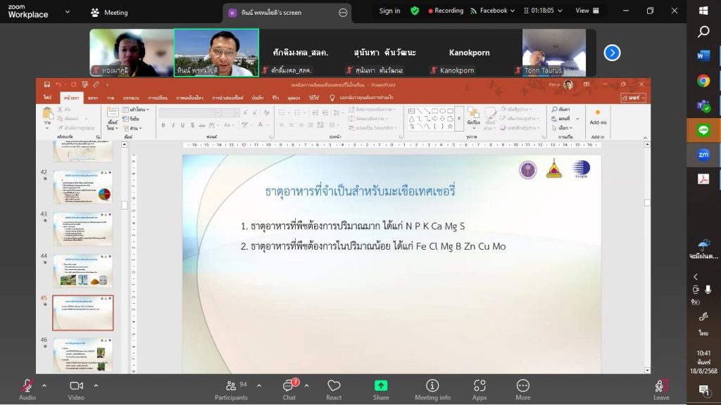 วันที่ 18 สิงหาคม 2568 นายจตุพร อิ่มจิตร เกษตรอำเภอทองผาภูมิ มอบหมายให้ นายสุเมธ หงษ์สาชุม นักวิชาการส่งเสริมการเกษตรชำนาญการ เข้าร่วมการฝึกอบรมเชิงปฏิบัติการ “เทคนิคการปลูกมะเขือเทศเชอรี่อินทรีย์ในโรงเรือน” จัดขึ้น ณ สถานีวิจัยลำตะคอง อำเภอปากช่อง จังหวัดนครราชสีมา ระหว่างเวลา 08.30 – 12.00 น. ผ่านระบบประชุมออนไลน์ (ZOOM)