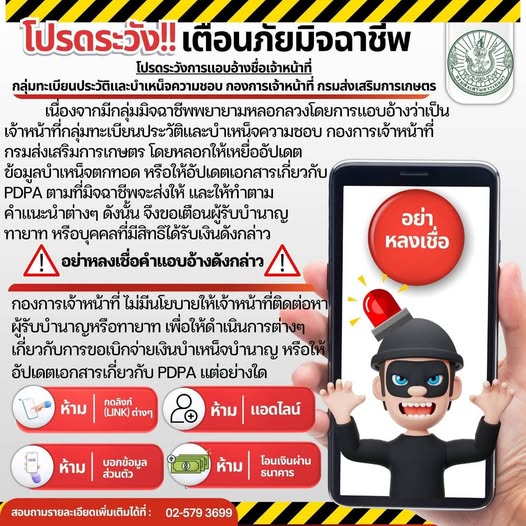 แจ้งเตือนภัยมิจฉาชีพ แอบอ้างชื่อเจ้าหน้าที่กรมส่งเสริมการเกษตร