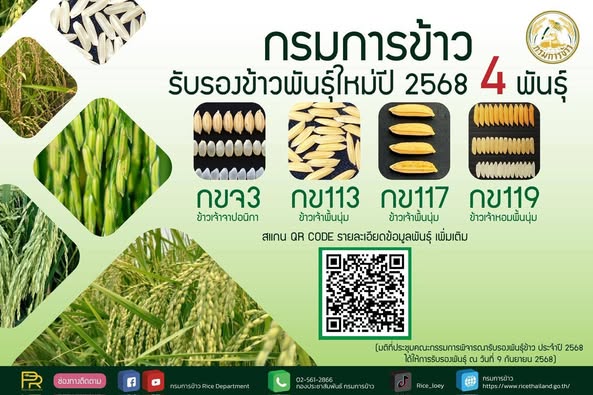 กรมการข้าว รับรองข้าวพันธุ์ใหม่ ปี2568 จำนวน 4 พันธุ์ – กขจ3 – กข113 – กข117 – กข119 Facebook...
