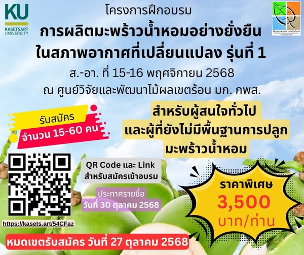 ภาควิชาพืชสวน คณะเกษตร ม.เกษตรศาสตร์ กำแพงแสน ขอเชิญผู้ประกอบการ เกษตรกร และผู้สนใจ เข้าร่วมอบรมเชิงปฏิบัติการ “การผลิตมะพร้าวน้ำหอมอย่างยั่งยืนในสภาพอากาศที่เปลี่ยนแปลง” รุ่นที่ 1 อัดแน่นด้วยความรู้จากผู้เชี่ยวชาญเพื่อเพิ่มศักยภาพการผลิต กำหนดการ: 15-16 พ.ย...