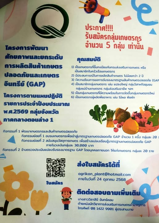 กรมส่งเสริมการเกษตร โดยสำนักงานเกษตรจังหวัดกาญจนบุรี ขอเชิญชวนกลุ่มเกษตรกรสมัครเข้าร่วม โครงการพัฒนาศักยภาพและยกระดับการผลิตสินค้าเกษตรปลอดภัยและเกษตรอินทรีย์ (GAP) (โครงการตามแผนปฏิบัติราชการประจำปีงบประมาณ พ.ศ. 2569 กลุ่มจังหวัดภาคกลางตอนล่าง 1) คุณสมบัติผู้สมัคร 1) เป็นเกษตรกรที่ขึ้นทะเบียนกับกรมส่งเสริมการเกษตร หรือเป็นสมาชิกในครัวเรือนเกษตรกร...