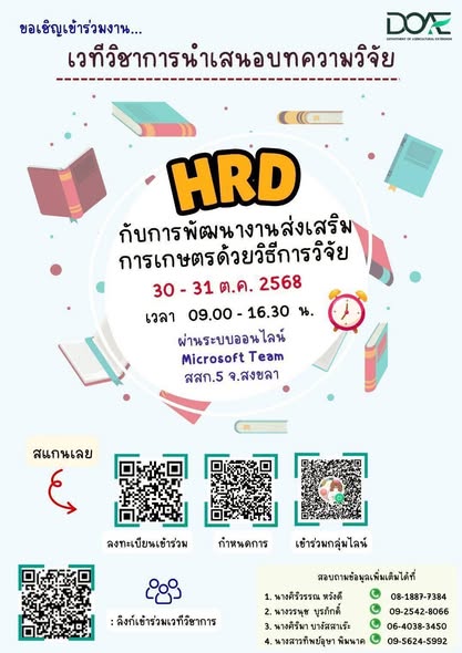 วันที่ 30 ตุลาคม 2568 นายจตุพร อิ่มจิตร เกษตรอำเภอทองผาภูมิ มอบหมายให้นายสุทัศน์ สุขศีลล้ำเลิศ นักวิชาการส่งเสริมการเกษตรปฏิบัติการ เข้าร่วมเวทีวิชาการ นำเสนอบทความวิจัย เรื่อง HRD กับการพัฒนางานส่งเสริมการเกษตรด้วยวิธีวิจัย ผ่านระบบ zoom meeting